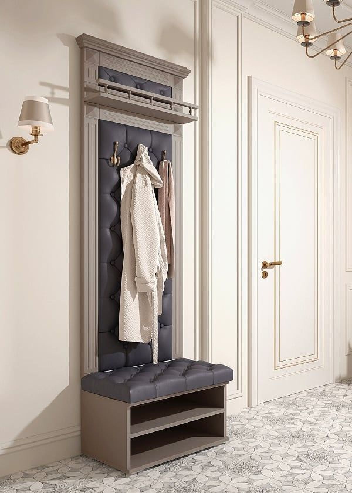 ***Декоративный карниз из натурального массива, полка с декоративной балюстрадой, декоративные утяжки на вешалке и сиденье, декоративные фрезерованные планки.